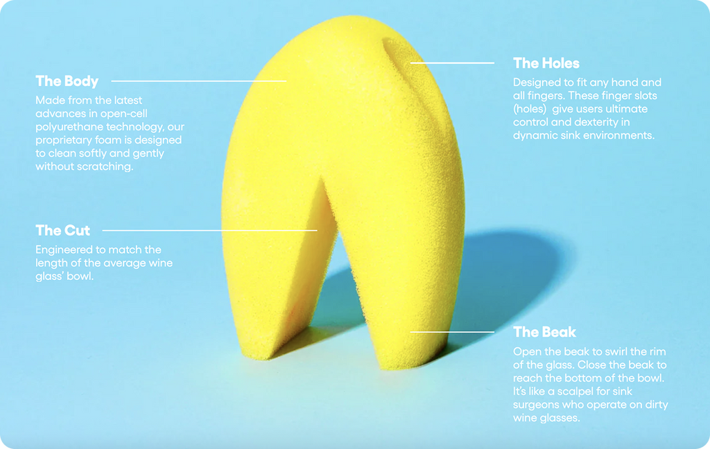 The only sponge designed to clean wine glasses with control, care, and style. This signature ergonomic sponge is dishwasher safe, and non-abrasive.